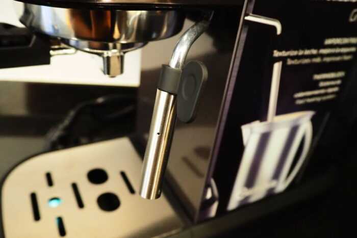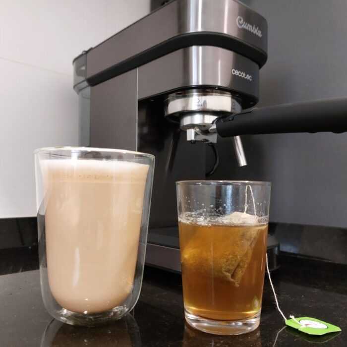 Tiene un brazo vaporizador orientable que sirve para espumar leche para hacer lattes, capuccinos y también para servir agua caliente para infusiones.