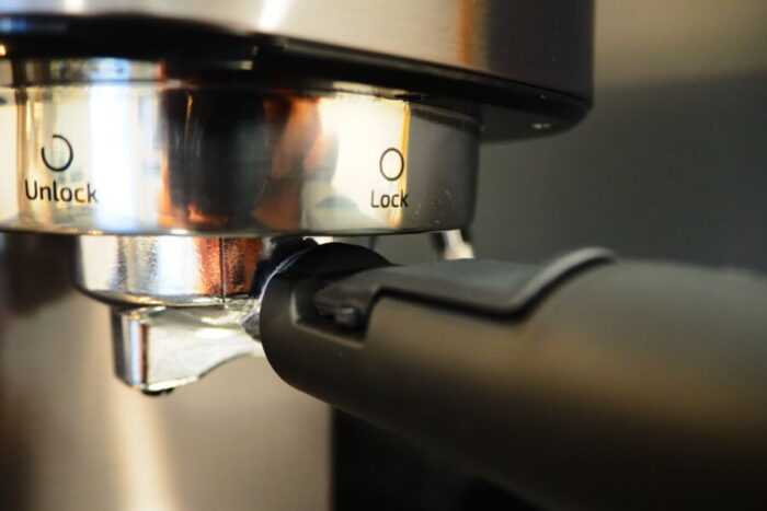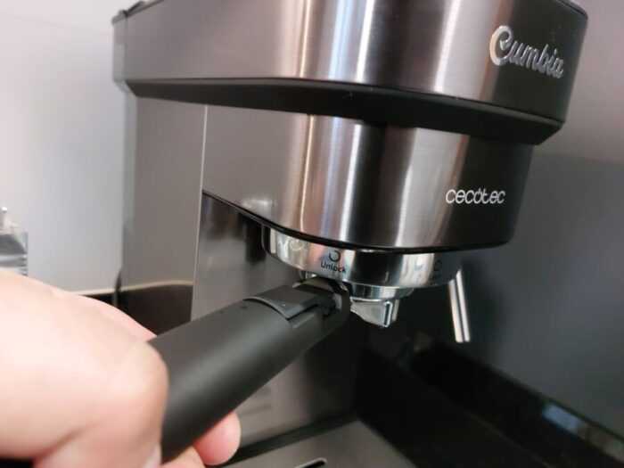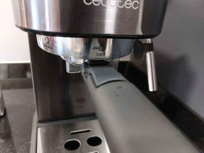Se limpia de café los bordes del porta y se coloca en la cafetera. Se pone el mango en posición unlock y se gira a la derecha hasta lock. Sencillo y de giro suave.