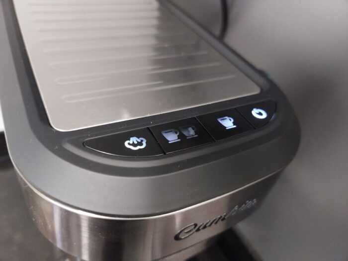 El funcionamiento es sencillo, cuenta únicamente con 4 botones y un selector giratorio: De derecha a izquierda en la foto: Botón de encendido y apagado, botón para un café, botón para dos cafés o café largo y botón para activar el modo vaporizador. En la imagen vemos que está lista para servir el café simplemente pulsando un botón.