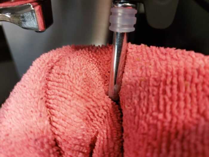 Simplemente hay que retirar el cilindro y lavarlo bien bajo el grifo y aclarar. Va unido al brazo a presión con una junta de goma, es sencillo de retirar y colocar. El brazo lo limpiaremos con un paño o un papel de cocina húmedos hasta que no quede ningún resto de leche y además echaremos un poco de agua para eliminar cualquier posible traza de leche en el interior del conducto.