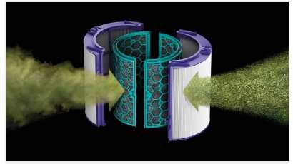 En el Dyson Pure Cool se combina un filtro de carbono activo y un filtro de fibra de vidrio HEPA que captura el 99,95 % de las partículas contaminantes de hasta 0,1 micras.
