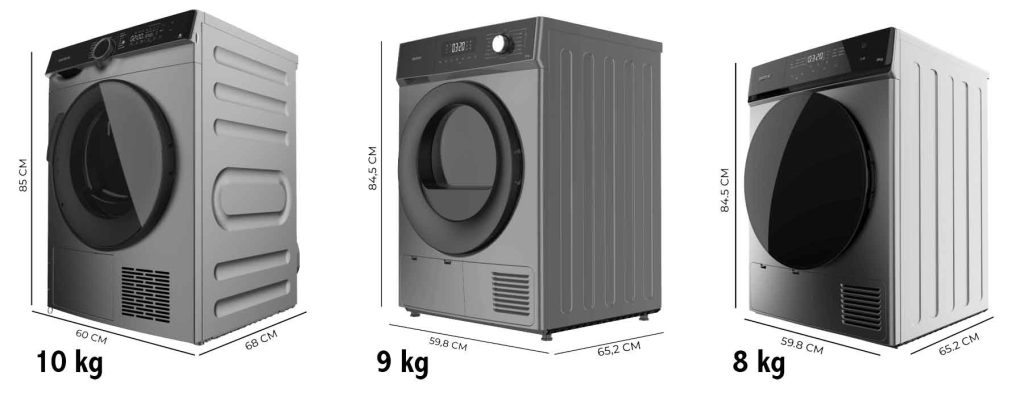 En el caso de las secadoras las opciones para los 4 modelos son blanco y steel, un acabado metálico oscuro, como el de las imágenes de las medidas que son todas el acabado steel.