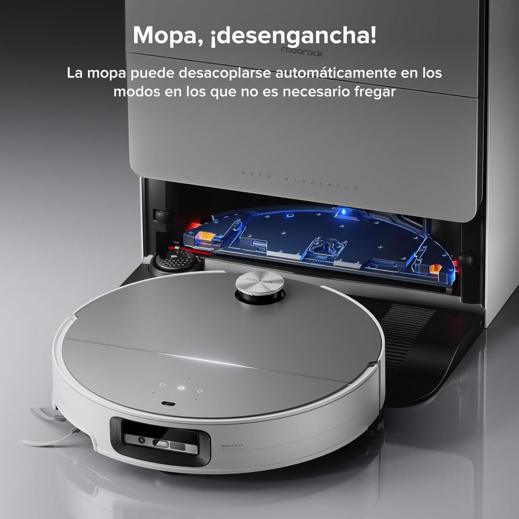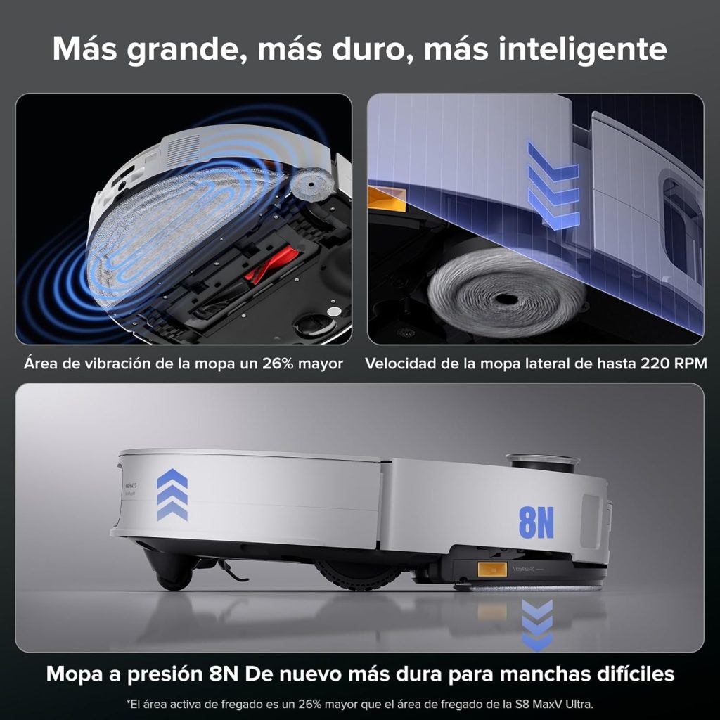 No es sólo que aspire: también tiene fregado avanzado. El módulo de fregado vibra (“VibraRise 4.0”) a unas tasas muy altas, tiene presión descendente hasta 8 N y una zona de vibración más grande que en modelos anteriores. Además, cuando detecta alfombras o zonas de solo aspirar, desmonta la mopa automáticamente, para que esas zonas no se mojen. Si tienes suelo de baldosa en cocina o baño y alfombra en el salón, esto marca la diferencia.