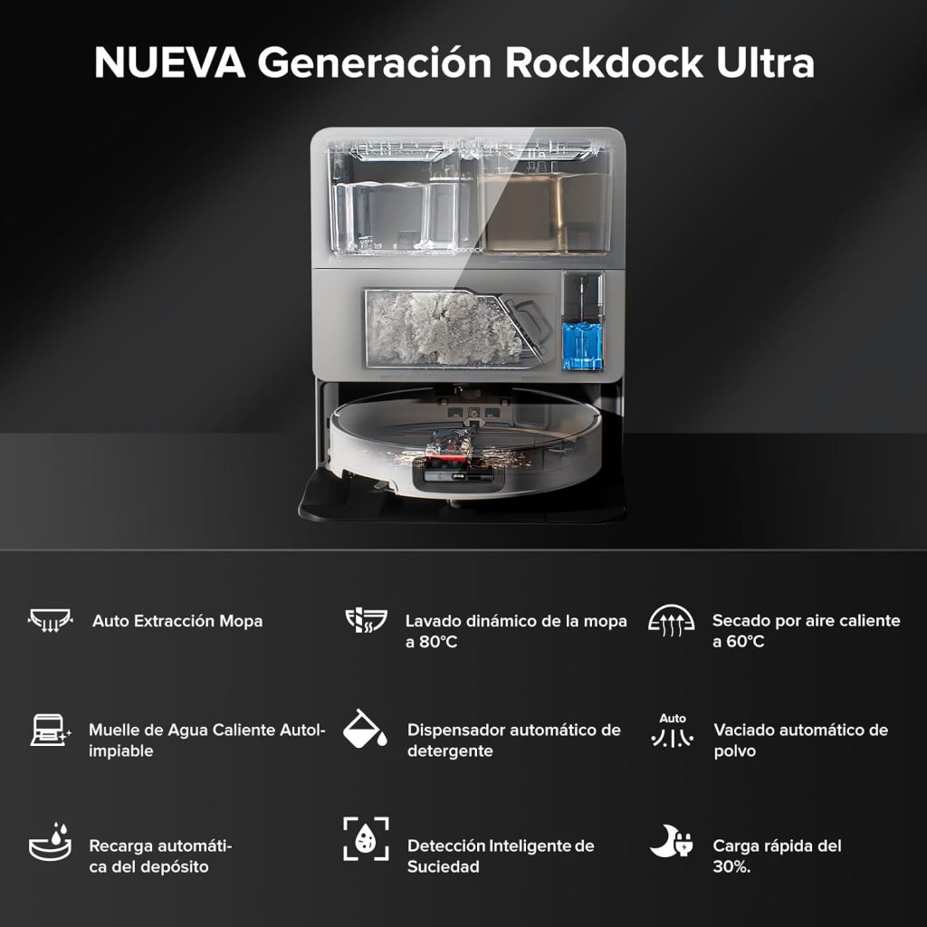 La “estación” no es un mero muelle: la base RockDock® Ultra 2.0 tiene múltiples funciones: lavado dinámico de la mopa a 80 °C, secado a 60 °C, carga rápida (batería de 6 400 mAh recargada en unos 150 minutos)… En definitiva, menos quehacer manual para ti.