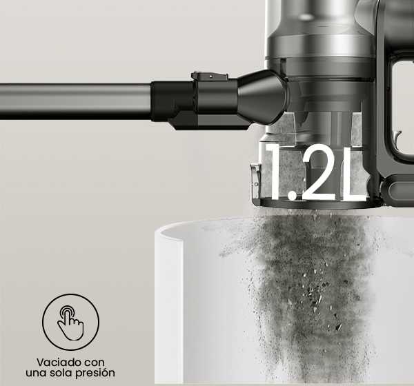 Como todas las aspiradoras verticales, la Proscenic P12 es una spiradora son bolsa y tiene un enorme depósito de 1,2 litros en disposición vertical y que dispone de un sistema de vaciado higiénico con un solo clic que libera una trampilla por la que cae la suciedad directamente al cubo de la basura.