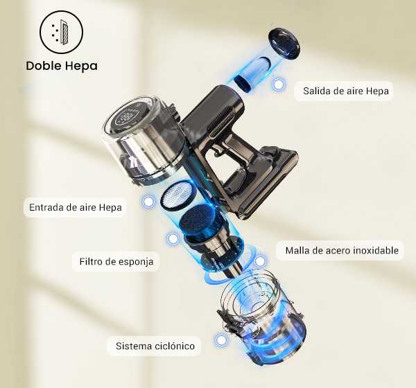 | Filtración | Cinco etapas: sistema ciclónico, malla de acero inoxidable, esponja, HEPA de entrada de aire, HEPA de salida de aire |